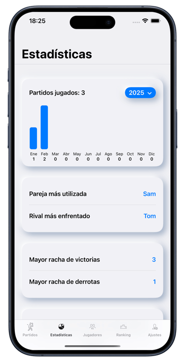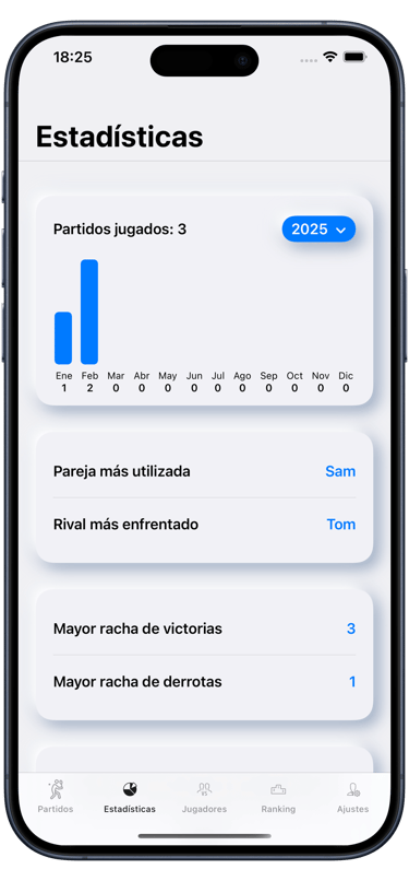 Controla tu racha de victorias, el número de remontadas, la cantidad de juegos, sets y saques que ganas y más datos de interés para analizar tu rendimiento.